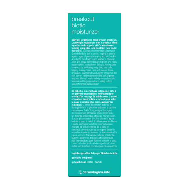 Dermalogica Breakout Biotic Moisturiser is a daily gel that targets and helps prevent breakouts. This lightweight moisturiser with a prebiotic blend helps to hydrate and support skin’s microbiome, helping aging skin look healthier, now and in the future. Bioengineered Plankton Extract and Glycerin hydrate skin’s barrier, helping to defend against signs of premature aging and soothe skin. A prebiotic blend with Indian Mulberry, Glutamic Acid, and Agave-derived Inulin hydrates and helps balance skin’s microbiome. Salicylic Acid reduces breakouts by exfoliating away dead skin cells, helping to keep pores clear and prevent future breakouts. Niacinamide and Jojoba strengthen the skin barrier, helping to reduce the look of pores and post-blemish marks to brighten and smooth. Manuka and Magnolia extracts visibly reduce sebum for more balanced skin.
