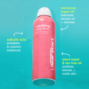 Dermalogica Clarifying Body Spray is a breakout-fighting body spray that acts fast on those hard-to-reach areas to help clear clogged pores and minimize future body breakouts. The refreshing mist even disperses upsidedown so you’ll never miss a spot. Exfoliating Salicylic Acid helps to remove dead skin cells, while soothing Witch Hazel, Tea Tree Oil and Moroccan Argan Extracts balance oil and reduce redness. Ideal for use after a shower, post-workout or even on the go.