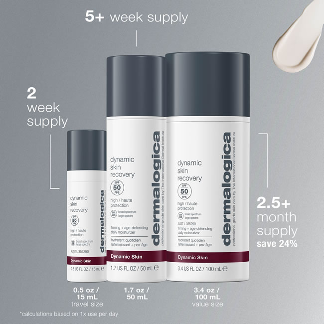 Dermalogica Dynamic Skin Recovery SPF50 will help you achieve absolute hydration and help defend against the internal and external causes of skin aging with this medium-weight, emollient daily moisturiser with SPF50. A patented polypeptide combined with Glucosamine and Soy stimulates collagen synthesis, enhances the skin’s natural ability to fight skin-aging free radicals (Reactive Oxygen Species) and helps prevent the signs of aging caused by sugar reacting with proteins in skin (AGEs). White Tea polyphenols regulate the formation of collagen-degrading MMPs brought on by UV rays while tripeptides, stabilized Vitamin C, Yeast Extract and Phytoestrogens help catalyze the skin’s natural collagen production to enhance skin firmness. Advanced sunscreen technology provides critical protection from daylight exposure, yet blends smoothly into skin to create a perfected finish.