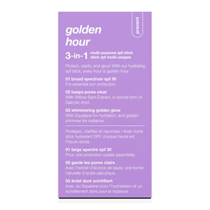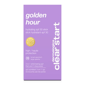 Dermalogica Golden Hour Clarifying SPF30 Stick is a 3-in-1 Hydrating SPF stick: Protect with SPF30, Clarify with Willow Bark Extract, a natural form of Salicylic Acid, and Glow with a golden shimmer for all skin tones. Squalene and Jojoba seed oil provide lasting hydration and radiance. Non-comedogenic formula means it won’t clog your pores. Throw it in your bag for a glow on the go! Use all over your face and body. Effortlessly glides onto skin, and perfect under or over makeup.