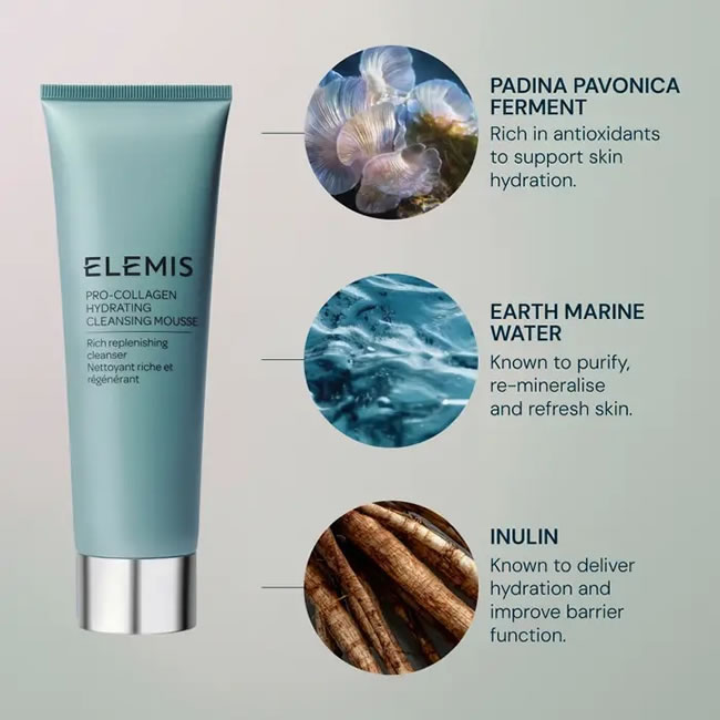 Elemis Pro-Collagen Hydrating Cleansing Mousse is a clinically proven to increase skin hydration by 125% after just one use. The transformative cream-to-light silky mousse deeply cleanses and effortlessly removes makeup, SPF, and impurities without stripping or drying the skin. Combining silken-soft textures with high-performance ingredients, the hard-working formula delivers deep purification with the gentlest touch. Fermented by biotechnology to enhance its antioxidant properties, padina pavonica ferment supports skin hydration, while earth marine water is known to purify, re-mineralise, and refresh the skin. Inulin, a natural prebiotic, is known to help improve skin barrier function and deliver deep hydration to dry skin, leaving your complexion feeling soft and comforted.