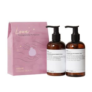 Evolve Organic Beauty Pomegranate Perfection Kit is an organic hand wash and lotion set with an uplifting and deliciously fruity combination of pomegranate and goji to gently wash and smooth with super soothing aloe and moisture-locking quinoa. It's the perfect duo for deliciously soft skin.