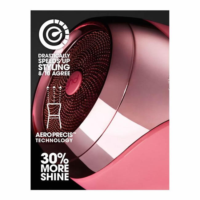 Designed for speed, control and a super smooth blow dry. This stylish and lightweight pink hairdryer harnesses Aeroprecis technology, a combination of four advanced internal elements, to deliver a powerful, highly concentrated airflow to give you 30% more shine and drastically faster styling. With a bespoke contoured nozzle to focus airflow and advanced ionic technology, the ghd helios rose pink hair dryer reduces frizz and flyaways, empowering you with a super smooth blow dry and 3x more hair alignment.