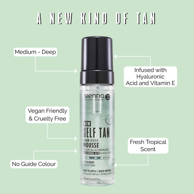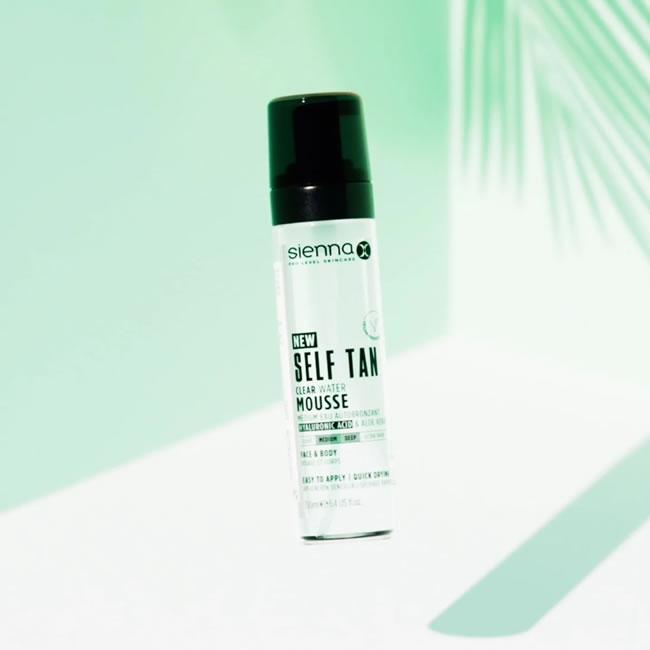 Sienna X Self Tan Clear Water Mousse is the new-gen way to tan at home. Creating a flawless medium-deep glow with just one application, this vegan formulation contains no guide colour, meaning no development stain transfer. Use it anytime, anywhere, without getting residue onto clothes, towels or bed sheets. A light clear sheen upon application helps you to see where you’ve already applied. This product is ideal for creating a medium-dark shade, suitable for new or experienced tanners. Star ingredients include Hyaluronic Acid, holding up to 1000x it’s own weight in water, to hydrate, and Aloe Vera to soothe and moisturise. A fresh summer fragrance creates an at-home holiday aura, with notes of Peach, Honey Blossom, Jasmine and Amber.