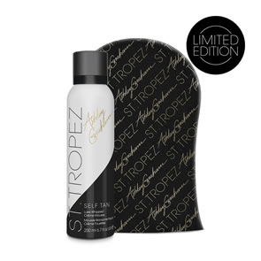 St.Tropez Tan x Ashley Graham Limited Edition Ultimate Glow Kit contains the new Self Tan Luxe Whipped Creme Mousse and the limited edition Applicator Mitt co-created by Ashley Graham.